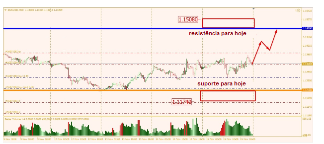 O volume máximo de compras ficou em 1.1500, que é 1,1470 em preços forex. Ele atuará como resistência hoje.
