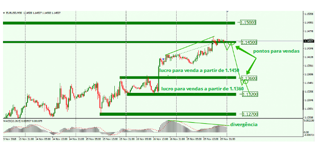 Contanto que o preço permaneça abaixo de 1,1450 ou mesmo uma falsa quebra de 1,1450 ocorra, haverá uma oportunidade para abrir um negócio de venda.