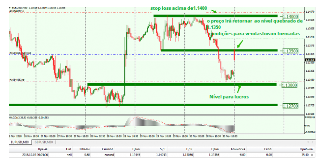 O preço conseguiu voltar para 1,1350, então a venda foi fechada. Ao mesmo tempo, houve a consolidação de preços acima desse patamar, o que gerou condições para as compras. Após a abertura das compras, o preço rompeu o nível de 1,1350 novamente. Após o breakout, a redução de preço criou as condições para transferir a ordem de lucro para a faixa de abertura da posição.