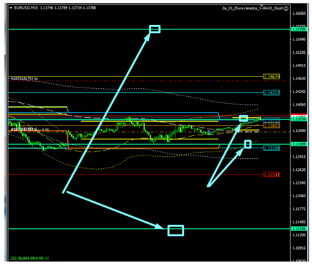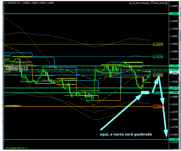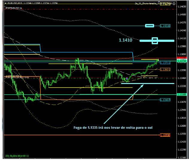 O cancelamento do cenário do sul é uma fuga de 1,1335. No M15, vamos romper o nível de 1.1335 e virar para o sul, mas outro cenário será necessário lá. Bem, até agora, temos o cenário do norte. Hoje, se tudo correr bem, chegaremos a 1,1450, e se não houver movimentos, estaremos aguardando a próxima sessão asiática, porque só os asiáticos trabalham bem agora.