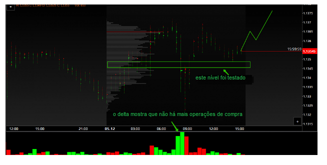 O gráfico delta mostra que o mercado é dominado pelos compradores. Mas o preço não pode aumentar muito.