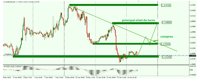 De acordo com os níveis horizontais, o nível de resistência mais próximo está no intervalo de 1,1350. Ao atingir esse intervalo, a compra deve ser fechada.