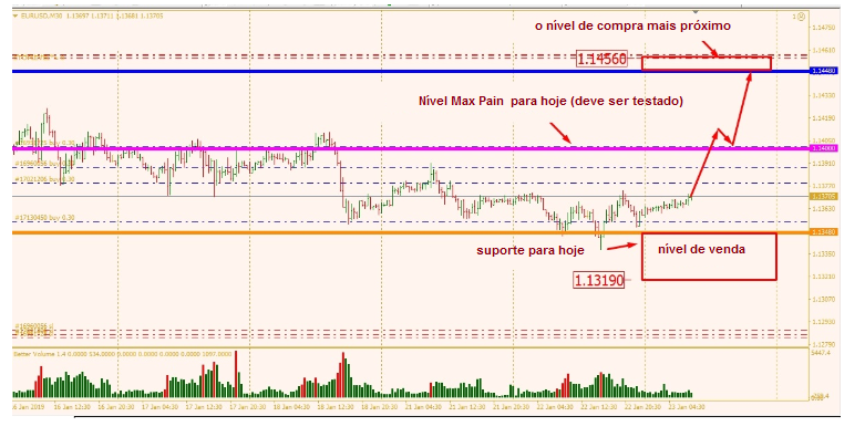 O segundo nível é Max Pain em 1,1400. Este nível deve ser testado hoje. Nesse intervalo, já podemos colocar pedidos de lucro para compras. Se houver uma quebra desse nível, poderemos adicionar compras.