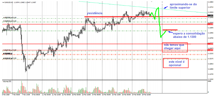 O recuo foi realizado para 1,1330 como esperado, agora precisamos atualizar o mínimo de quinta-feira, 1.1270. Após a baixa ser atualizada, o M15 irá automaticamente para a zona de venda. E então poderemos tentar alcançar os níveis de 1.1250 e 1.1210. Quando o nível de 1.1280 for quebrado, será necessário fazer um zigue-zague para cima e depois para baixo no M15. Para transformar o M15, esses zigue-zagues são necessários. Devemos chegar ao nível de 1,1310 e, em seguida, haverá outro movimento para 1,1280. Essa aproximação deve ser confirmada, isto é, com um rompimento e movimento para o nível 1.1250. Aqui está um gráfico de como avançar no H1.