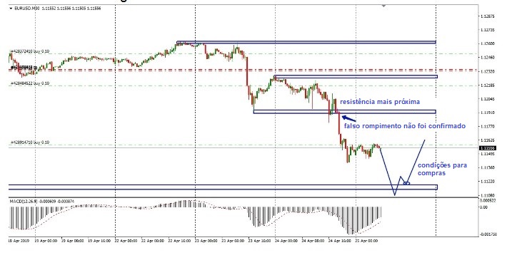 Para criar um sinal de compra, precisamos esperar por um teste de 1,1150, talvez até com a formação de um falso rompimento.