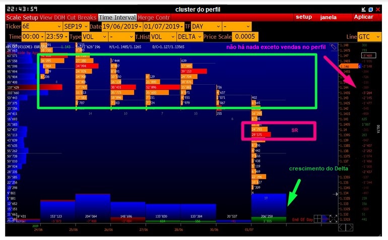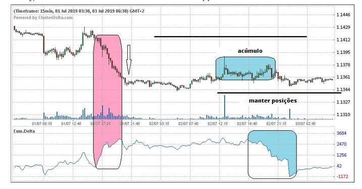 De acordo com o delta cumulativo e os volumes de tick, pode-se observar que houve dois picos de volume, portanto, o fechamento foi realizado em duas etapas.