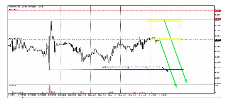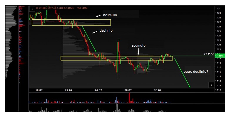 Se considerarmos o mês anterior, pode-se notar que, no período de 5 a 22 de julho, o par euro-dólar também acumulava posições, apenas em uma faixa mais ampla.