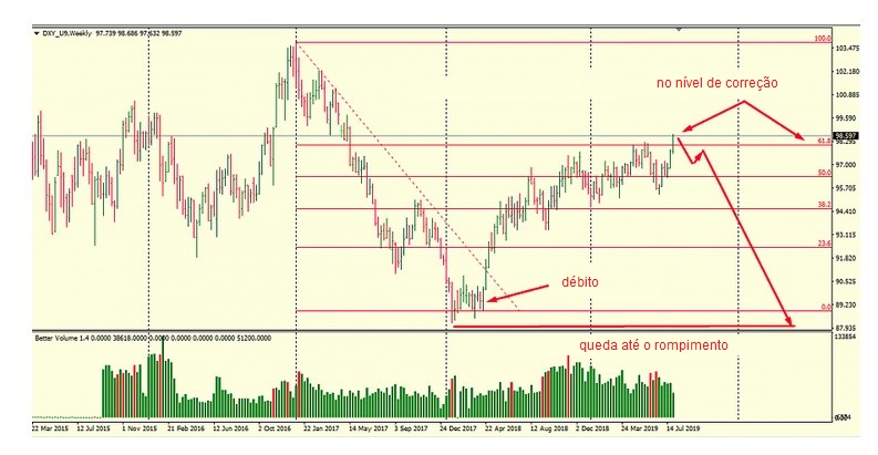 De acordo com o gráfico semanal, temos um nível correcional de 61,8% de Fibo.
