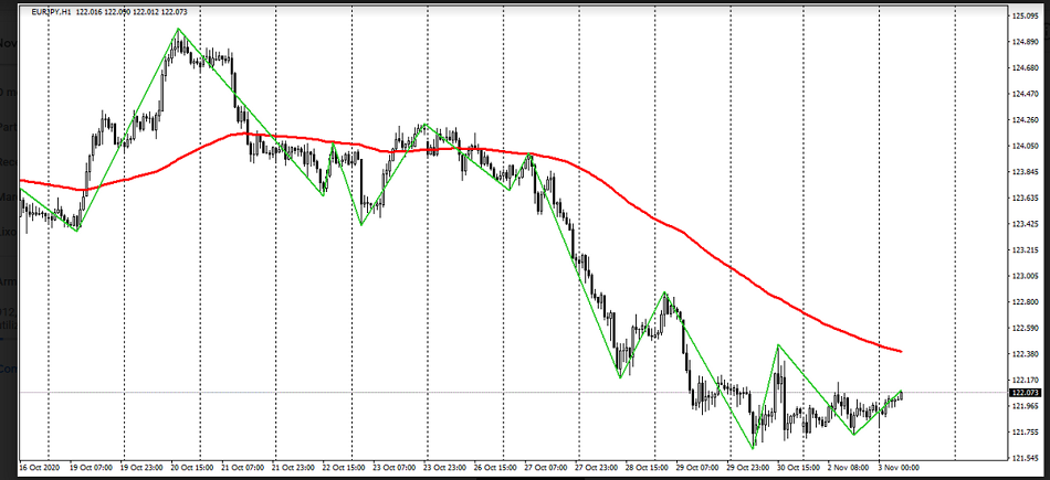 Pode-se observar que o par euro / iene está sendo negociado atualmente em uma tendência de queda. A média móvel de 120 dias confirma a direção descendente do par, uma vez que está acima do preço. O indicador zigue-zague também aponta para a vantagem dos vendedores sobre os compradores.