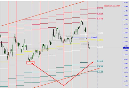Há indicadores com atualização na segunda-feira, e outro na quarta-feira. Ontem, atraiu-me por um nível, marcado com uma linha pontilhada vermelha. Estes são os seus níveis mais extremos, que eu estudei com a ajuda do histórico, eles estão sendo bem trabalhados, e a segunda característica é que se o preço ultrapassar estes níveis, então, na grande maioria dos casos, irá retornar para eles no curto prazo. Então agora, neste lugar onde o preço está localizado, existem dois níveis. Isso não significa que você tenha que comprar. Para mim, isso significa que no momento as vendas estão fechadas nesse lugar. Eu vou esperar por um retorno às barras inferiores, que estão localizadas no nível da dívida de ontem no limite inferior quebrado do OC, em 1,4175, e próximo do nível do MZ de hoje, então é aí que considerarei as vendas. Quanto às compras, se o preço cair ainda mais em relação às atuais, deixando outra débito, então considerarei uma compra, para que ele seja validado.