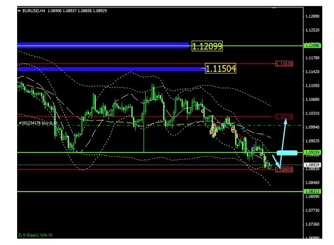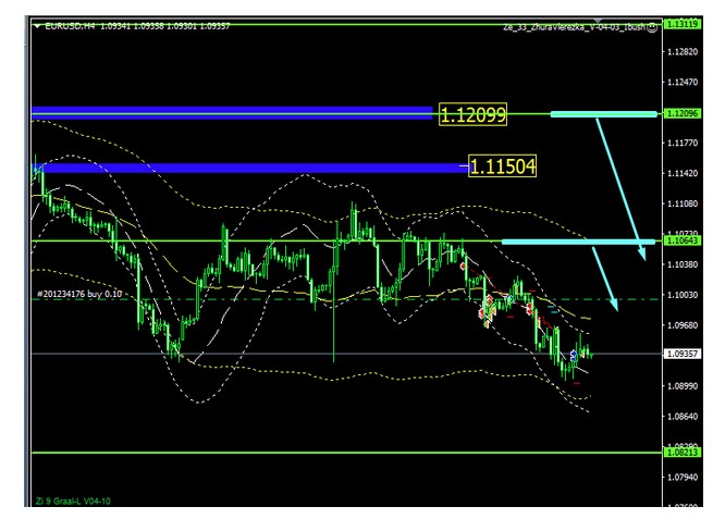 Agora vamos descobrir o que o sistema mostra e em quais níveis a tendência de baixa deve ser interrompida. A quebra da tendência de baixa não significa uma reversão. É apenas um grande recuo. As reversões geralmente ocorrem no período diário. Então, vamos começar com D1. É direcionado para o lado negativo, essa é a tendência geral. O período diário será quebrado no nível de 1.1200 e, enquanto estamos abaixo, a tendência permanece em queda. Is4 é direcionado para baixo. Geralmente mostra quando um grande recuo começa. O início do recuo será confirmado no nível 1.1070. Após cada confirmação da tendência de alta, sempre fazemos um zigue-zague de volta para o lado negativo. Isso mostra o humor entre ursos e touros.