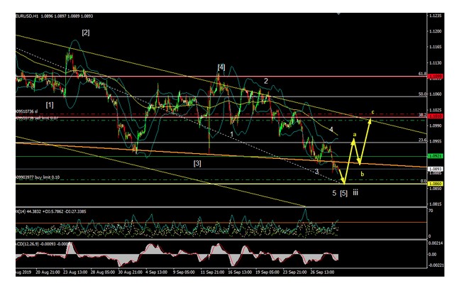 Agora, vamos considerar a situação de um ponto de vista técnico e descobrir como ela pode ser apresentada no gráfico. Agora vejo que a terceira onda de declínio está sendo concluída no gráfico. Geralmente, é a onda mais longa. Para que ele se torne o mais longo, precisamos concluir o atual movimento de baixa o mais cedo possível, em 1,0860. Podemos até atravessá-lo e descer um pouco. Quanto à estrutura técnica, tudo faz sentido. Todas as ondas de baixa ordem são claras. Em seguida, precisamos fazer uma correção e mover de acordo com a quarta onda. O alvo é 1,1010.