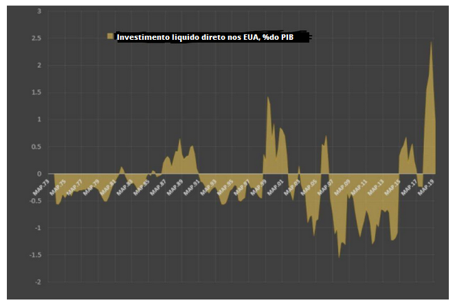 O tema do "fracasso" tornou-se especialmente espinhoso assim que Donald Trump foi eleito presidente dos EUA. Ele prometeu "tornar o americano grande novamente". No entanto, ele entrou em uma luta com metade do mundo e quase todos os aliados militares e econômicos dos EUA. Em meio a este tumulto, ele tem que enfrentar seus adversários que estimam a ideia de seu impeachment. Entretanto, tenho de conhecer os dados sobre os fluxos de capitais para o período em análise. Aqui estão os dois gráficos. O primeiro revela o influxo de investimento estrangeiro líquido na economia dos EUA, expresso em percentagem do PIB. O que é exatamente o investimento estrangeiro líquido? É, por exemplo, quando um investidor estrangeiro vem e constrói uma fábrica no território.