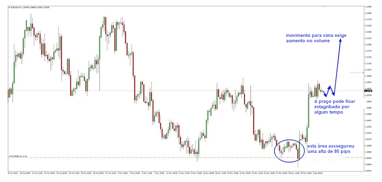 Para comparação, você pode ver quanto tempo levou para acumular volume para um rally de 80 pips. Se quisermos subir mais, vai demorar o mesmo tempo a obter o volume requerido.