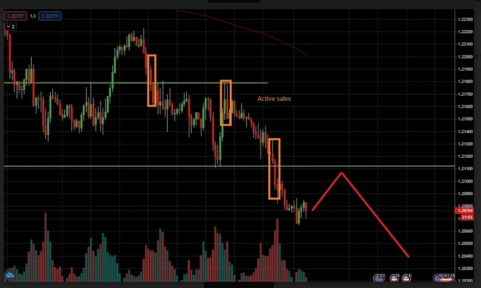 2. Depois de testar um dos níveis de resistência, é provável que o preço continue sua correção profunda até o nível de suporte de 1,2040.