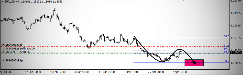 Na negociação, eu uso os níveis de correção de Fibonacci de 38,2% e 50% para determinar os pontos para entrar no mercado. Ainda mantenho posições vendidas por meio da ordem pendente acionada anteriormente. Espero que em um futuro próximo as cotações se movam para a zona onde uma ordem de lucro está localizada.