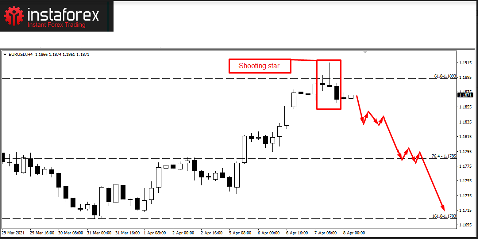 O padrão de estrela cadente "shooting star" foi formado no gráfico de 4 horas. Este padrão representa uma vela de reversão de baixa. Hoje, espero que o par euro / dólar caia dos níveis de 1,1870-90. A marca de 1.1785 pode ser vista como um alvo onde existe apoio. O próximo nível alvo para o declínio do par é 1,1703. As cotações provavelmente testarão esses níveis no final desta semana ou na próxima terça-feira.