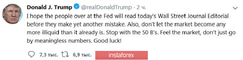 Hoje ele complementou sua opinião com outro tweet, cujo texto vale a pena citar: "Não deixe o mercado se tornar ainda menos líquido do que é agora. Sinta o mercado, não apenas persiga os números sem sentido". Eu acho que quaisquer comentários são desnecessários aqui. E embora Trump jure não tenha influência direta sobre o Fed, a posição que ele expressou complementou o quadro sombrio na véspera da reunião chave para o dólar.