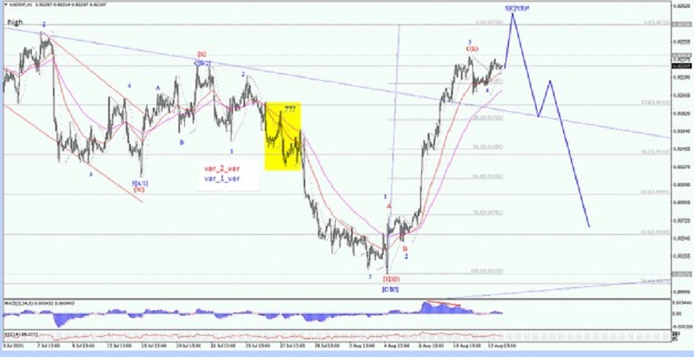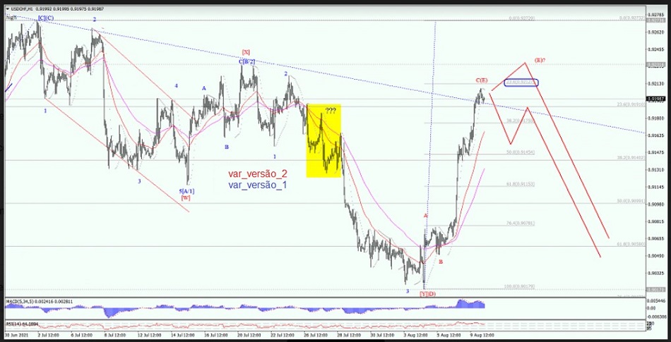 O franco não dá sinais de queda. Tudo indica uma recuperação para 0,9273. Pode quebrar o triângulo (quebra de triângulo falso com uma tendência de baixa acentuada). Talvez eu venda depois da onda inicial a partir de segunda-feira.
