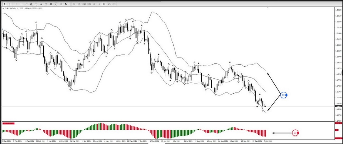 Em vez disso, vou esperar que o par caia abaixo do nível de 1.1574, ou seja, a linha do meio do envelope de acordo com o gráfico 4H. Neste caso, os indicadores 4H, D1 e até 1H sinalizarão uma tendência de queda, criando assim uma forma livre de riscos para entrar no mercado.