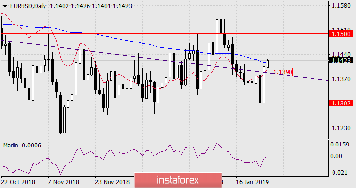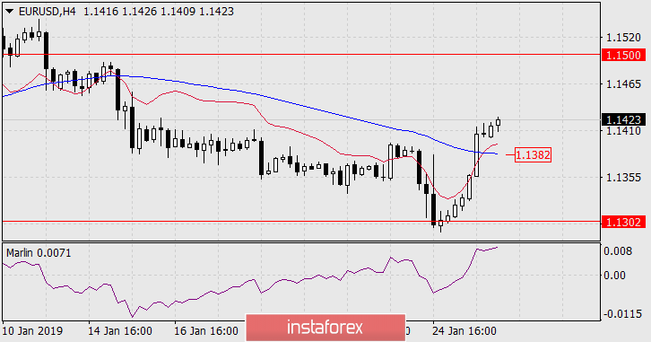 Na sexta-feira passada, a Casa Branca e o Congresso chegaram a um acordo temporário para acabar com a paralisação. Mas, essa notícia positiva foi ofuscada pela prisão de Roger Stone, ex-assessor político de Donald Trump, em conexão com o "caso do Kremlin". Na mídia de negócios do Ocidente, há um trecho de atrelar o declínio do dólar à prisão de Stone; em vez disso, houve fechamento em massa de posições curtas no final do mês. As informações sobre a intenção do Fed de concluir a redução do saldo antes da data agendada poderiam ter sido mais efetivas. Os Estados Unidos e a Europa, sob pressão dos EUA, reconheceram o líder parlamentar da oposição venezuelana, Juan Guaido, como presidente da Venezuela durante o fim de semana, apoiando assim a agitação política naquele país. O evento é definitivamente a favor do dólar. O crescimento do euro na sexta-feira foi adiado pela linha da escala diária da Krusenstern. Com uma alta probabilidade hoje, o euro vai cair. A confirmação deste cenário será a fixação de preços abaixo da linha do canal de preços do gráfico diário e sob a linha Krusenstern do gráfico de quatro horas - 1.1382 / 90. O propósito do declínio será novamente o nível de 1.1302. Consolidando abaixo, abrirá o caminho para 1.1195. Um novo crescimento é possível após fixar o preço acima da linha de escala diária da Krusenstern - o alvo será a máxima em 7 de novembro de 1.1500.