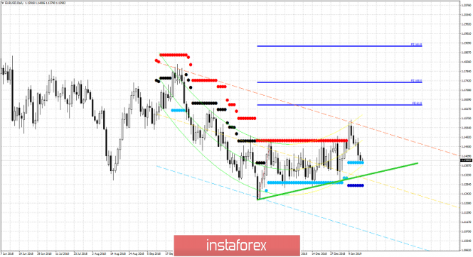 EUR / USD permanece em uma tendência de baixa de curto prazo dentro de um canal inclinado para baixo. O preço parou seu declínio próximo do nível de retração Fibonacci de 61,8% da última perna, de 1,13 para 1,1570.