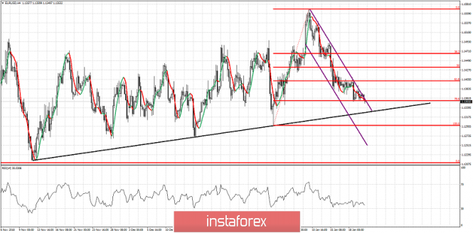 EUR / USD continuou seu movimento para baixo e atingiu 1.1353. Nossa análise passada explicou que uma quebra abaixo de 1,14-1,1380 levaria os preços para 1,1320 e o suporte de linha de tendência inclinada para cima a longo prazo. O preço continua a fazer mínimas e máxima mais baixas, mas permanecemos acima da área de suporte crítico de 1,1320-1,13.