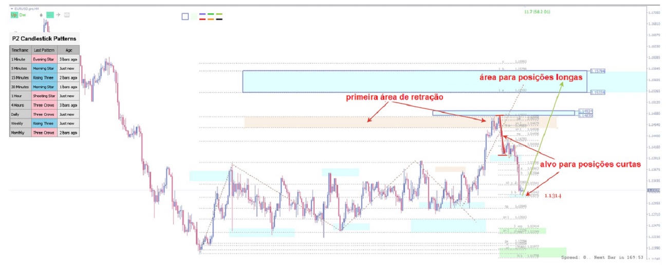 EUR/USD hoje o preço atingiu a meta em 1,1314 e começou a se consolidar no M15.