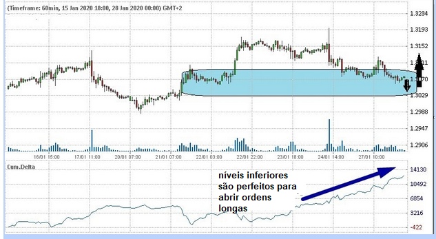 O delta de duas horas indica que estamos atualmente na área do comprador do limite de médio prazo.
