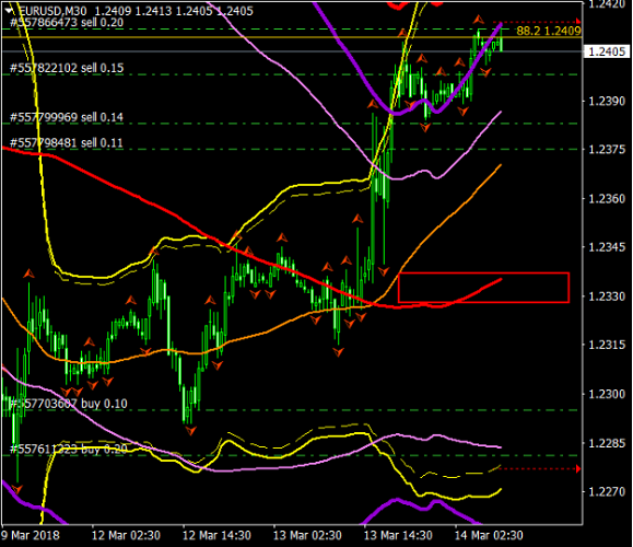 A coisa certa a fazer é vender o par em direção à borda inferior da faixa de negociação. Quanto a prazos mais longos, o preço está indo para o norte, então não vou vender, embora o stop loss esteja muito próximo aqui. Não vejo sentido em aumentar as ordens de venda até que o par saia da faixa de negociação na direção norte. Enquanto isso, estou totalmente desapontado. O mercado antecipou o aumento da taxa e, eventualmente, conseguiu. Não esclareceu o sentimento. Mudei minhas ordens de compra para o ponto de equilíbrio. Eu vou ver o que está acontecendo no comércio asiático. Provavelmente, isso vai esclarecer a situação. Ultimamente, traders asiáticos eram frequentemente responsáveis por quebrar níveis importantes. Atualmente, vejo o seguinte no gráfico de 1 hora. O par se moverá para o norte, desde que possa se fixar acima da zona superior laranja. A menos que o par infrinja esta zona, nós temos que negociar no mercado plano com perspectivas de queda. A questão é se vai cair para o nível de suporte ou abaixo do intervalo de negociação.
