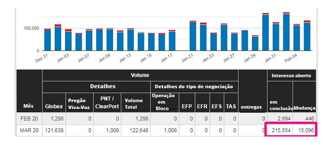 Quanto ao contrato de março, o interesse aberto aumentou em 202.840 contratos. Na sexta-feira, 3.413 contratos foram adicionados, o que é mais de 1,5% por dia.