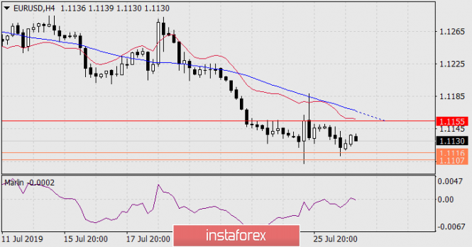 EUR/USD Na sexta-feira, o dólar se fortaleceu contra todas as principais moedas, o índice do dólar acrescentou 0,20%. O euro caiu 18 pontos. Neste dia, o otimismo para os mercados foi definido por bons dados sobre o PIB dos EUA - para o 2º trimestre, o aumento foi de 2,1% contra o esperado 1,8%. Houve uma ligeira correção esta manhã. Faixa de apoio de 1,1107 / 16 de duas tentativas (25 e 26 de julho)protegeu-se, o preço continua a consolidar no intervalo dos últimos quatro dias. Amanhã será um dia difícil - o Banco do Japão anuncia uma decisão sobre a política monetária, os indicadores de gastos do consumidor na Alemanha e na França também serão divulgados, e sobre a receita / despesa dos consumidores nos Estados Unidos. As previsões são otimistas para o dólar; Prevê-se que o clima alemão do consumidor da GfK para agosto diminua de 9,8 para 9,7, o consumo dos EUA para junho poderá aumentar 0,3%.