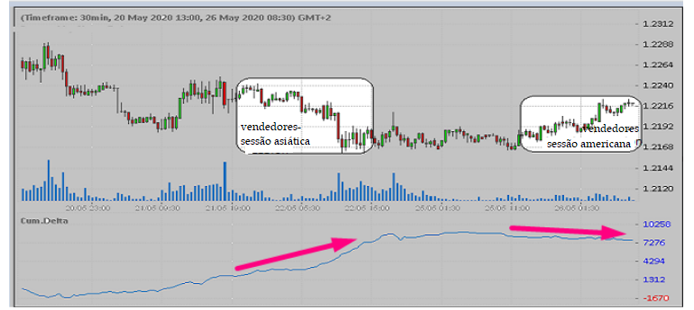Quanto à negociação intradiária, de acordo com o delta acumulado do M30, o preço atingiu a borda superior da área limite do vendedor.