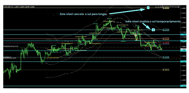 Níveis de acordo com a previsão semanal. Hoje, o nível do cancelamento do sul é de (1,1705). Ele cancela o sul por um tempo, isto é, pode-se dizer que o sul está em dúvida. O cancelamento do sul, a confirmação do norte por um longo período de tempo e uma volta possível está em (1.1835). Por hoje, o nível de confirmação dentro do dia é 1.1671 para o norte, já estamos acima dele, e o nível mais baixo de confirmação é 1.1612 para o sul. O que é interessante hoje é que o nível da confirmação do norte é também o cancelamento do norte no mesmo dia. Isso raramente acontece, mas acontece. Os níveis que estão entre parênteses são dinâmicos e podem mudar dentro durante o dia. A tela com níveis para a semana está abaixo.