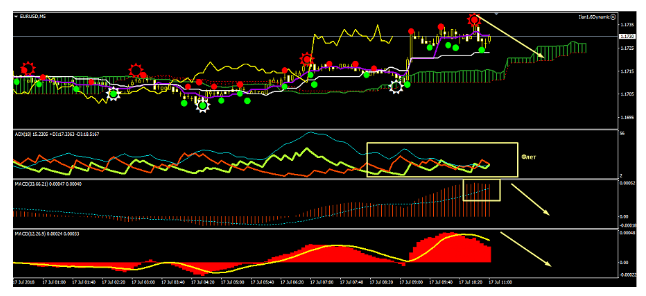 O indicador ADX mostra que não há força óbvia no momento. O indicador está produzindo movimentos em ziguezague, o que significa que podemos definir os limites do canal e negociar dentro dele. Outros indicadores mostram que os ursos estão ganhando força. Assim, o indicador MACD forneceu sinais de venda. Espero que o preço caia para 1,1710. Embora esta área esteja bem próxima, fecharei minhas ordens de venda e esperarei por oportunidades de compra.