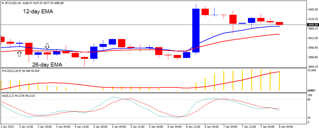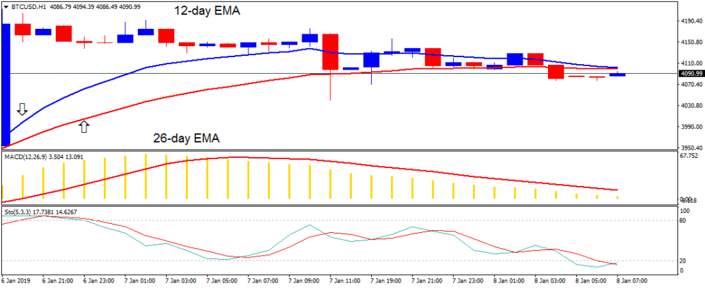 Attachment 2819Em 7 de janeiro, o preço do BTC alcançou a alta de US $ 4.218 e após essa máxima iniciou um movimento de recuou em relação recente alta desde o dia anterior. A desvalorização no preço da primeira criptomoeda encontrou um forte suporte pela MME de 12 dias. Os compradores conseguiram manter o preço acima da MME de 12 dias e da MME de 26 dias. O preço do Bitcoin sendo negociado acima da MME de 12 dias e da MME de 26 dias, indica que a criptomoeda tem a tendência de subir.