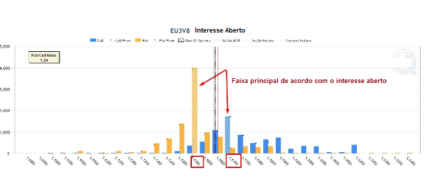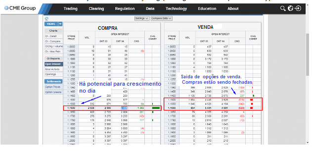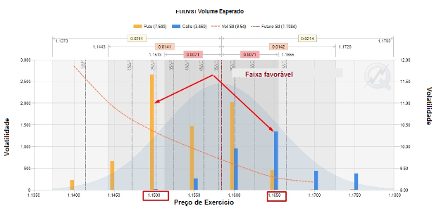 De acordo com as opções de compra, em 1,1650, temos o volume máximo negociado. Além disso, o interesse aberto é adicionado.