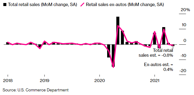 Provavelmente, com o isolamento, as pessoas diminuíram os gastos em viagens e restaurantes e passou a deixar mais dinheiro no Assim, o setor de serviços estava nas baixas, enquanto o varejo segurava as pontas. Agora, é a vez dos dois coexistirem de novo. Olha só o gráfico da Bloomberg: