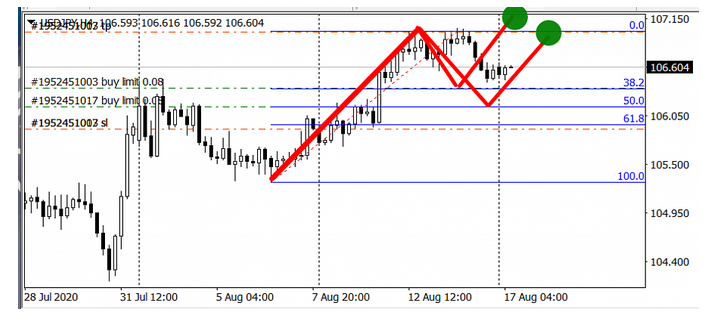 Assim, meus pontos de entrada estão nos níveis 38,20 (106,35) e 50,00 (106,15) da retração Fibonacci, e a ordem de limite de compra está logo abaixo do nível 61,80. Além disso, as ordens Stop Loss e Take Profit são colocadas em 105,90 e 107,00, respectivamente.