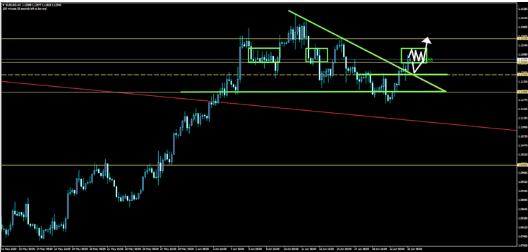 Como a borda superior da figura está quebrada e o preço permaneceu firmemente acima dela, os ursos podem facilmente empurrar o preço para algum lugar em direção ao nível de suporte de 1,12500, com o alvo de testá-lo novamente, após o que se espera que o preço suba.