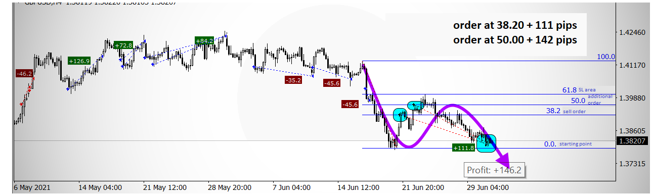 Ontem, o par libra / dólar finalmente caiu na zona onde minha ordem de realização estava localizada, ou seja, em 1,3810. Não muito tempo atrás, coloquei pedidos nos níveis de retração de Fibonacci de 38,2% e 50%. Como resultado, consegui lucros de 102 e 146 pips.