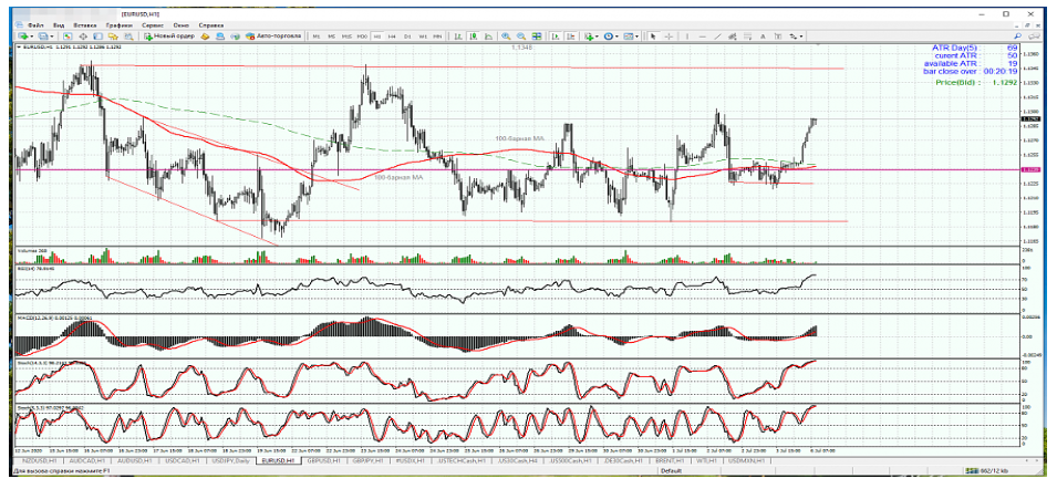 Aqui está a análise técnica do par EUR / USD em 6 de julho de 2020. Com base na média móvel de 100 barras, o mercado está em um estado não tendencioso. A linha está reta e levemente elevada no final. Após uma recuperação, o preço aumentou, atingindo a alta anterior em 1.1303. Há uma chance de que o preço comece a cair após outra recuperação. Se houver uma recuperação da média móvel de 100 barras e o preço começar a ficar baixo, isso sinalizará que, após a consolidação, o mercado estará pronto para o crescimento e uma tendência de alta. Se o preço estiver acima do nível horário de 1,1348, a tendência de alta será confirmada.