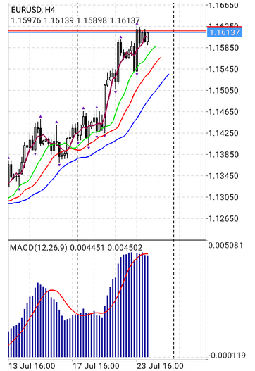 Quanto tempo leva para quatro horas, preço que aumenta para o nível 1.131 e valor para 1.1267, Senkou Span e indicador Ichimoku Cloud. Depois disso, é provável que o preço continue subindo para o nível 1.135 por meio de uma quebra no nível de resistência R1 de 1.131. Se o preço for consolidado acima desse nível, ou poderá subir para 1,1350. É provável que ocorra uma reversão após atingir o nível de 1.1401 através de uma quebra no nível de resistência R2 de 1.1353. Renko Scalper está mostrando sinais de reversão. O indicador МАСD está sinalizando negociações de compra, pois o histograma está localizado acima da linha de sinal. No caso de uma quebra no nível 1.1230, ou o preço pode cair para 1.1195.