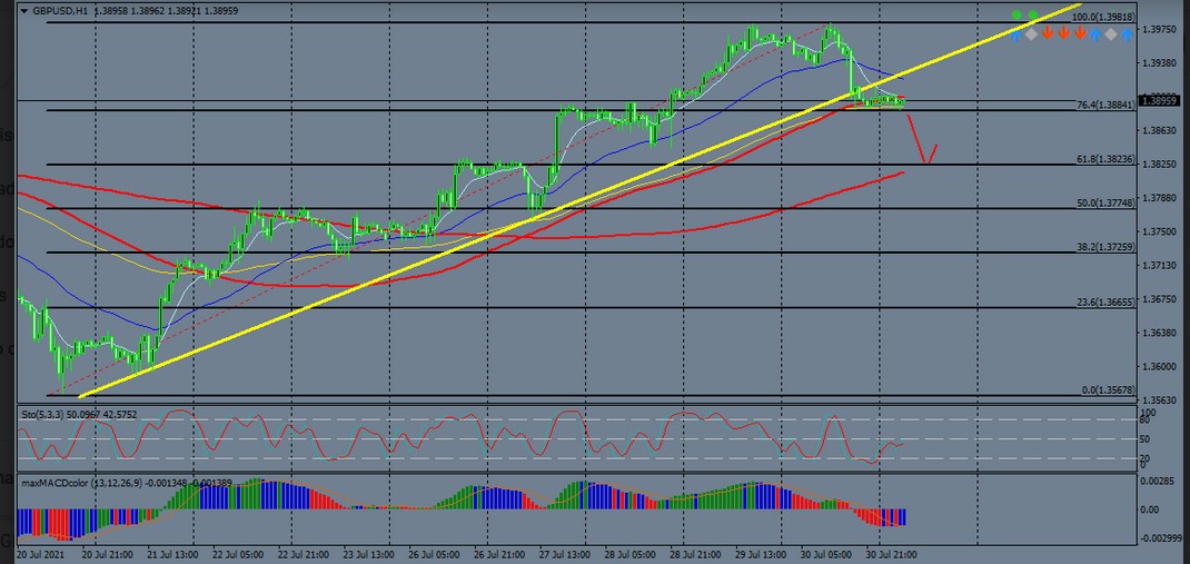 De acordo com o gráfico de negociação de uma hora, as cotações são altamente prováveis de romper o suporte em 1.3884, já que o preço está abaixo da linha de tendência de alta e da EMA100, o que é um sinal de momentum de baixa.