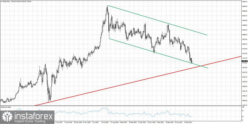 O preço do ouro permanece em tendência de baixa, fazendo mínimas e máximas mais baixas. O preço atingiu nossa área-alvo de $1.700- $1.690 e o principal retrocesso de Fibonacci de 38% de todo o aumento, desde a baixa em agosto de 2018 até a alta mais recente de $2.074.