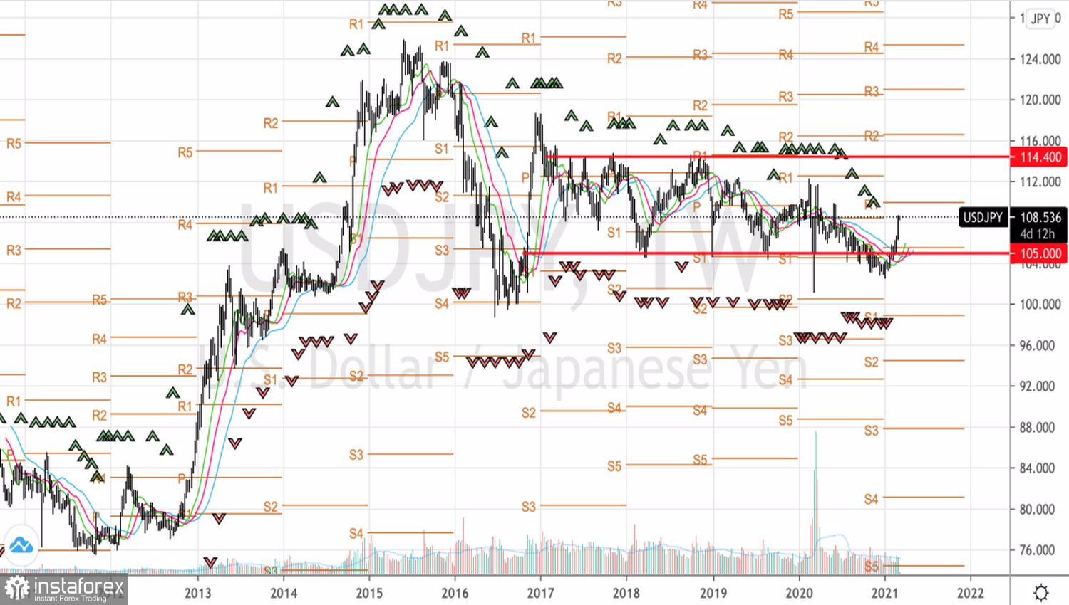 Uma reversão do índice de ações cria uma oportunidade favorável para os estrangeiros entrarem em posições compradas. Assim, o aumento dos diferenciais de rendimento, o crescimento explosivo da economia dos EUA e a atratividade crescente dos ativos dos EUA abrem o caminho para a tendência de alta do USD / JPY. Tecnicamente, no gráfico semanal do par analisado, existe um padrão "Decepção-outlier". Um teste malsucedido do limite inferior da faixa de consolidação 105-114,4 com um subsequente retorno das cotações ao seu meio é um sinal de compra. Os alvos estabelecidos no artigo anterior funcionaram, continuamos a abrir posições longas no USD / JPY com alvos em 110,0, 112,5 e 114,4. USD/JPY, gráfico semanal.