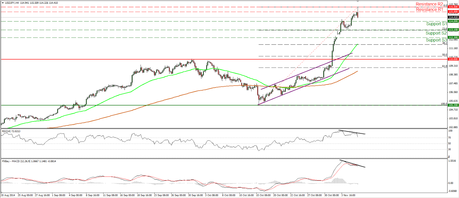 USD/JPY continuou a subir na Quarta-Feira, para encontrar resistência 50 pip’s acima da linha psicológica de 115.00 (R1). Mantenho a opinião de que a trajectória geral deste par é positiva, mas neste ponto, esperaria uma movimentação descendente correctiva antes que os bulls "puxem novamente o gatilho".