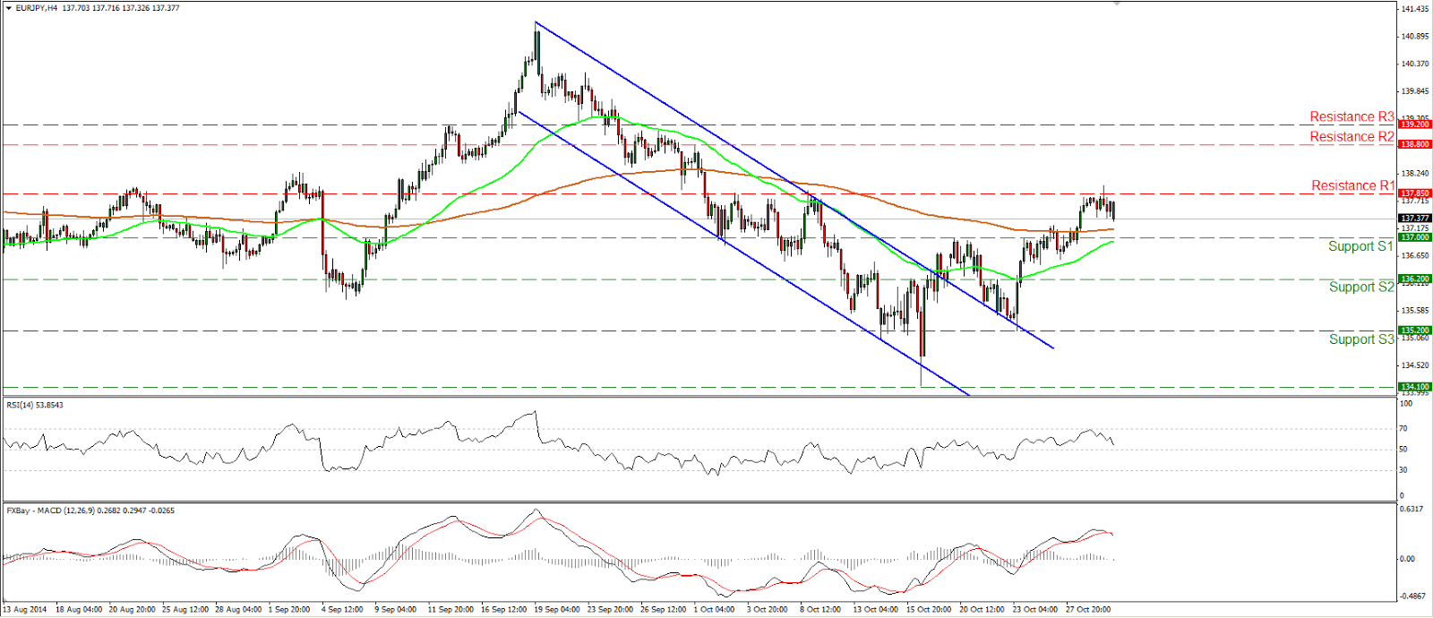 EUR/JPY subiu ontem, quebrando a linha de resistência (transformada em suporte) de 142.60 (S1). Hoje, durante o início da manhã Europeia, a taxa estava a dirigir-se para os máximos de Abril, nos 143.50 (R1), onde uma quebra ascendente decisiva iria provavelmente ter espaço para extensões em direcção à barreira de suporte transformado em resistência de 144.35 (R2), definida pelo mínimo de 31 de Dezembro de 2013. No quadro mais alargado, a quebra acima dos máximos de 19 de Setembro confirmou um máximo mais alto futuro no gráfico diário e mantém o outlook geral do par EUR/JPY positivo.